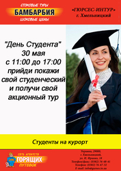 30 го мая в период с 11.00 до 17.00 акция "День Студента" Туры по спецусловиям смогут приобрести студенты, предъявившие нам свой студенческий билет..